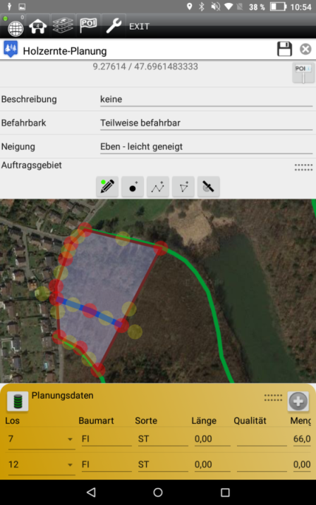 Beispiel Holzernteplanung mit Gis-Editor: Der Gis Editor erlaubt u.v.a. das Aufteilen einer Flächen in mehrere, um z.B. eine Schneise auszuschneiden oder eine teilweise abgearbeitete Fläche aufzuteilen.
